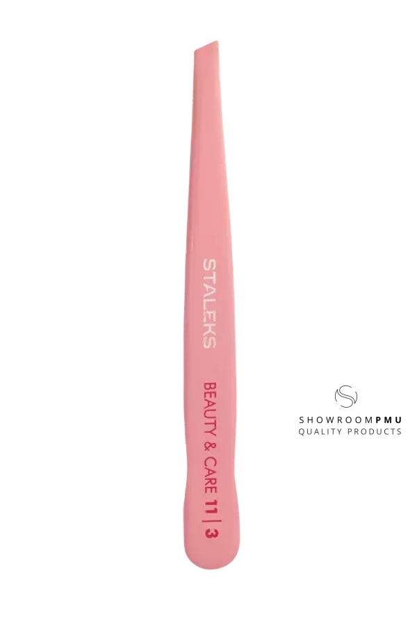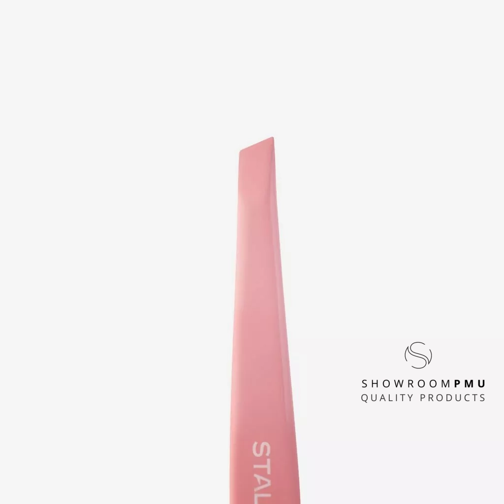 Pęseta w pełni radzi sobie ze specyfiką korekcji szerokich i grubych brwi i posiada ścięte brzegi dla ułatwienia użytkowania. Wykonana jest ze stali nierdzewnej, używanej do produkcji narzędzi chirurgicznych.